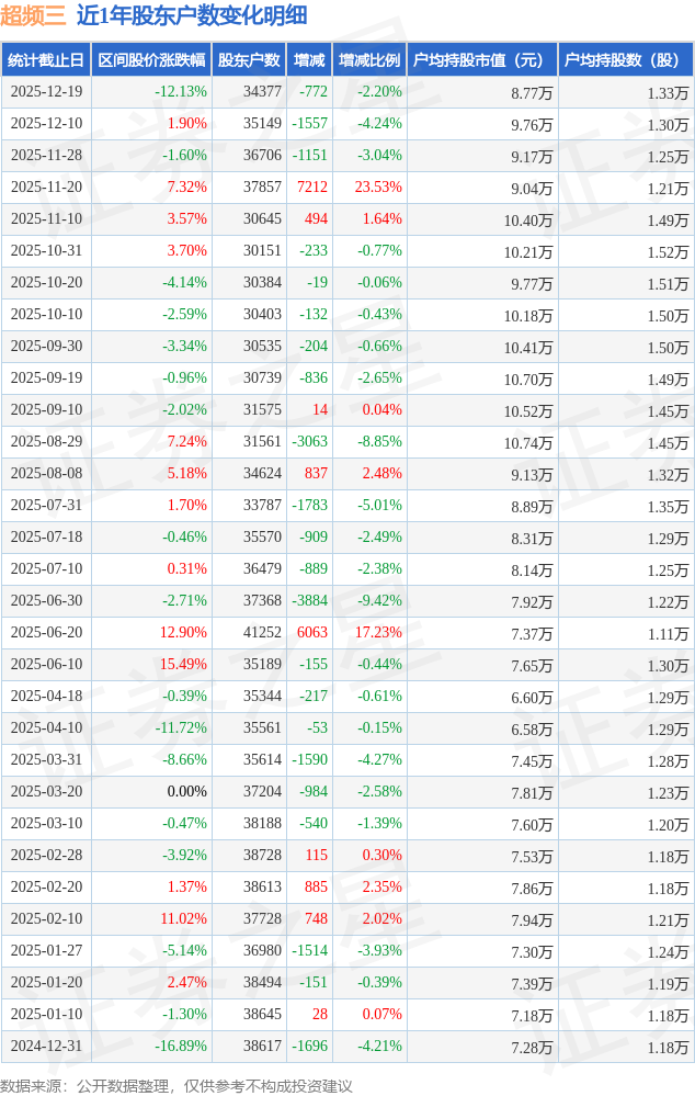 从股价来看,2025年12月10日至2025年12月19日,超频三区间跌幅为12.13%,在此期间股东户数减少772.0户,减幅为2.2%。
