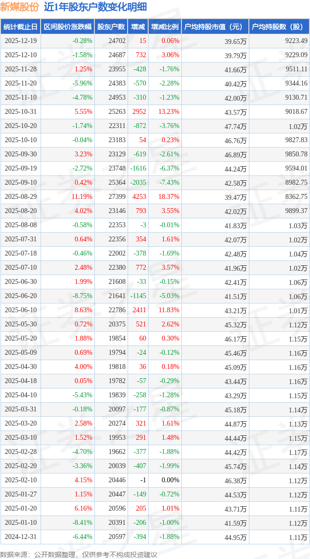 从股价来看,2025年12月10日至2025年12月19日,新媒股份区间跌幅为0.28%,在此期间股东户数增加15.0户,增幅为0.06%。