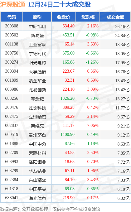 当日北向资金余额额度充足,创元科技(000551)领涨,涨幅10.01%,交易所公布的沪深股通二十大成交股中成交额前三的为中际旭创、新易盛、工业富联,成交额分别为26.16亿元、24.84亿元、18.34亿元。详情可见下表: