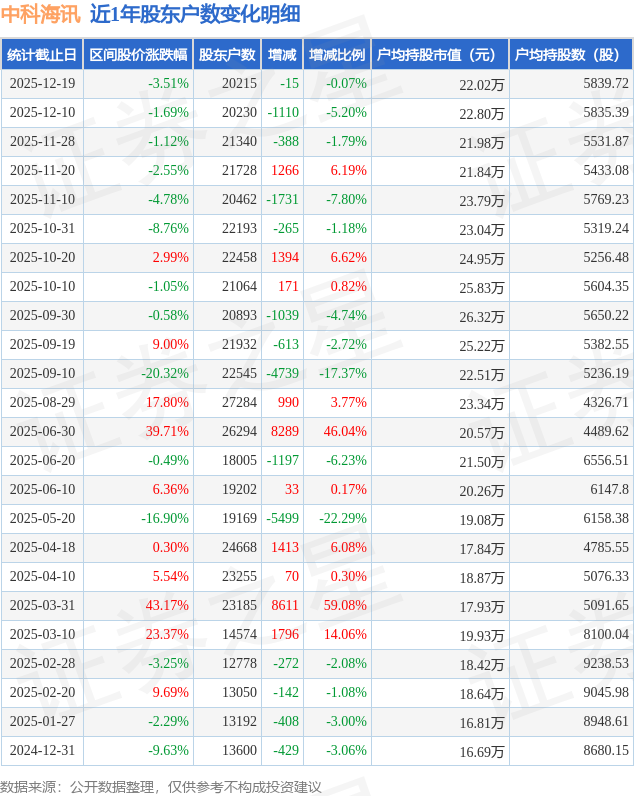 从股价来看,2025年12月10日至2025年12月19日,中科海讯区间跌幅为3.51%,在此期间股东户数减少15.0户,减幅为0.07%。