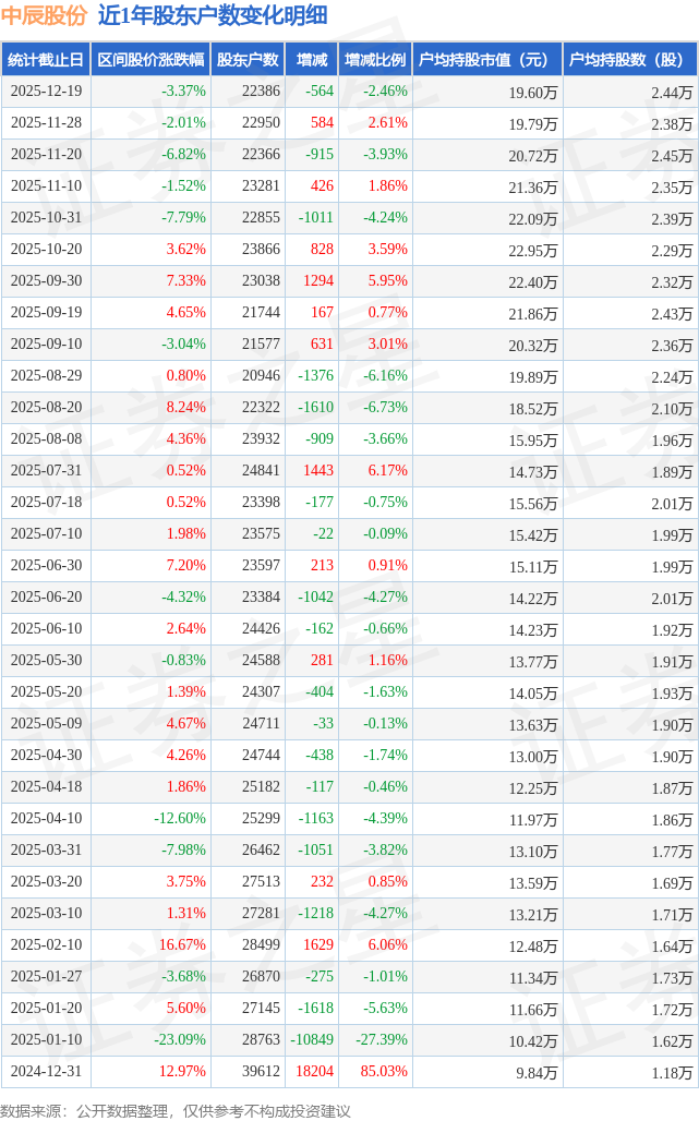 从股价来看,2025年11月28日至2025年12月19日,中辰股份区间跌幅为3.37%,在此期间股东户数减少564.0户,减幅为2.46%。