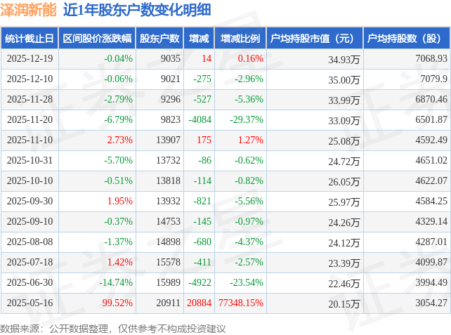 从股价来看,2025年12月10日至2025年12月19日,泽润新能区间跌幅为0.04%,在此期间股东户数增加14.0户,增幅为0.16%。