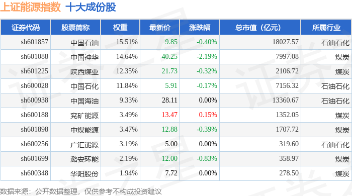 上证能源(000032)指数十大成份股详情如下: