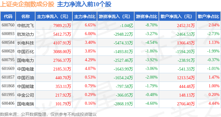 资金流向方面,上证央企(000042)指数成份股当日主力资金净流出合计26.38亿元,游资资金净流入合计4.7亿元,散户资金净流入合计21.68亿元。成份股资金流向详情见下表: