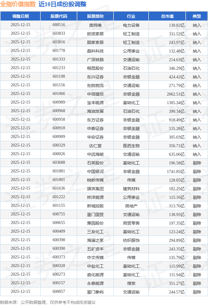 近10日内全指价值(000058)指数成份股做了调整,新纳入了16只股票,剔除了16只股票。