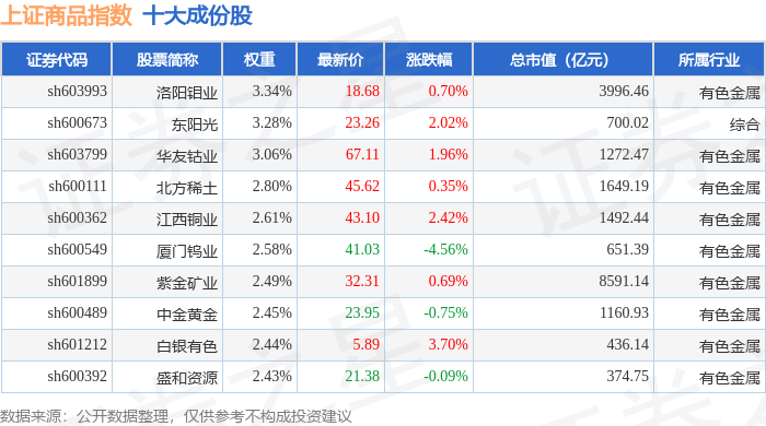 证券之星消息,12月24日,上证商品(000066)指数报收于3457.86点,涨0.24%,成交537.08亿元,换手率0.6%。当日该指数成份股中,上涨的有28家,白银有色以3.7%的涨幅领涨,下跌的有19家,厦门钨业以4.56%的跌幅领跌。