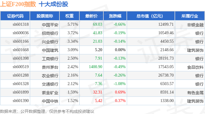 上证F200(000098)指数十大成份股详情如下: