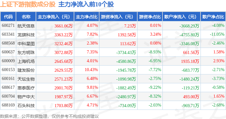 资金流向方面,上证下游(000096)指数成份股当日主力资金净流出合计34.54亿元,游资资金净流入合计1.79亿元,散户资金净流入合计32.76亿元。成份股资金流向详情见下表: