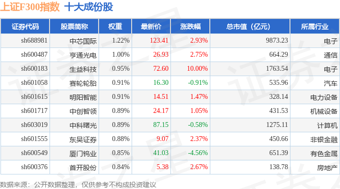 证券之星消息,12月24日,上证F300(000099)指数报收于9052.67点,涨0.86%,成交1457.13亿元,换手率1.25%。当日该指数成份股中,上涨的有211家,华光环能以10.02%的涨幅领涨,下跌的有67家,厦门钨业以4.56%的跌幅领跌。