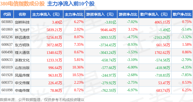 资金流向方面,380电信(000112)指数成份股当日主力资金净流入合计4302.55万元,游资资金净流出合计1.53亿元,散户资金净流入合计1.1亿元。成份股资金流向详情见下表: