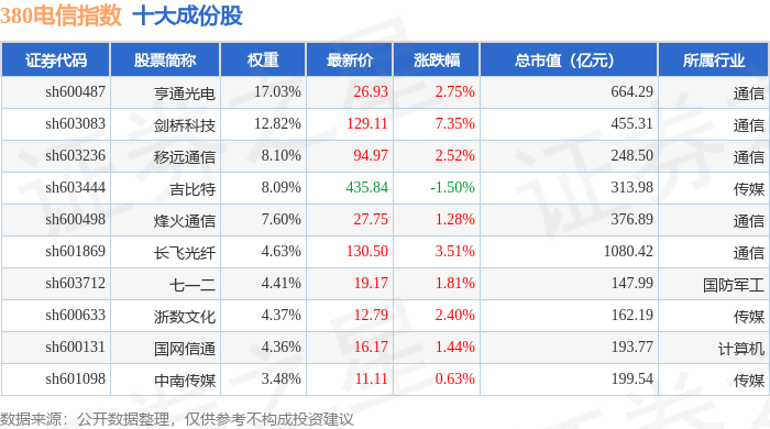 证券之星消息,12月24日,380电信(000112)指数报收于6151.49点,涨1.98%,成交199.08亿元,换手率2.09%。当日该指数成份股中,上涨的有18家,剑桥科技以7.35%的涨幅领涨,下跌的有3家,吉比特以1.5%的跌幅领跌。