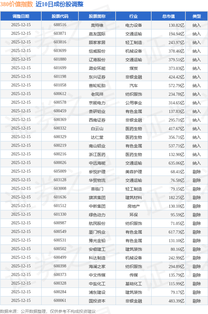 近10日内380价值(000118)指数成份股做了调整,新纳入了17只股票,剔除了16只股票。
