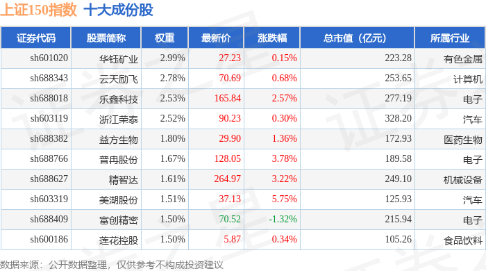 证券之星消息,12月24日,上证150(000133)指数报收于6654.49点,涨1.4%,成交418.81亿元,换手率3.68%。当日该指数成份股中,上涨的有129家,正和生态以10.02%的涨幅领涨,下跌的有19家,和林微纳以4.92%的跌幅领跌。