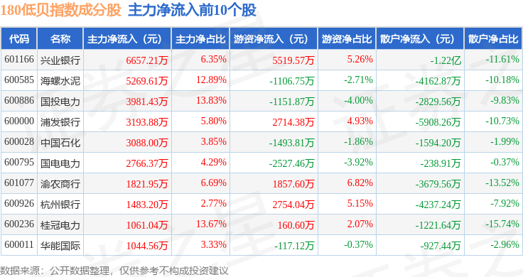 资金流向方面,180低贝(000136)指数成份股当日主力资金净流出合计19.99亿元,游资资金净流入合计10.12亿元,散户资金净流入合计9.88亿元。成份股资金流向详情见下表: