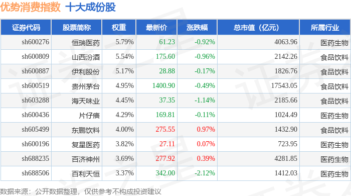 优势消费(000147)指数十大成份股详情如下: