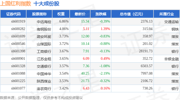 上国红利(000151)指数十大成份股详情如下: