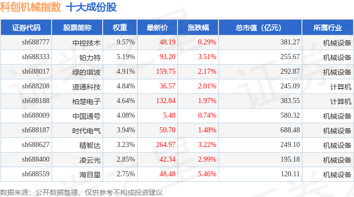 科创机械(000693)指数十大成份股详情如下: