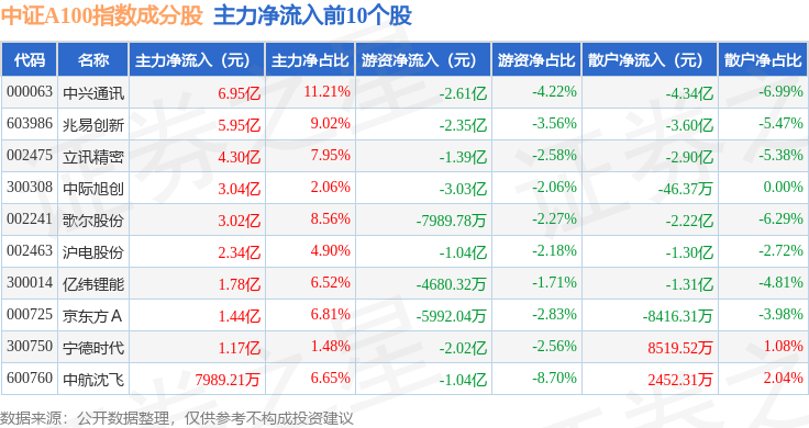 资金流向方面,中证A100(000903)指数成份股当日主力资金净流出合计39.25亿元,游资资金净流入合计4.29亿元,散户资金净流入合计34.96亿元。成份股资金流向详情见下表: