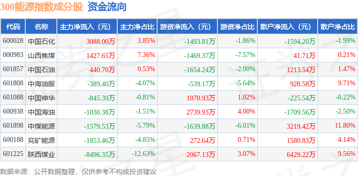 资金流向方面,300能源(000908)指数成份股当日主力资金净流出合计9238.16万元,游资资金净流出合计645.85万元,散户资金净流入合计9884.01万元。成份股资金流向详情见下表: