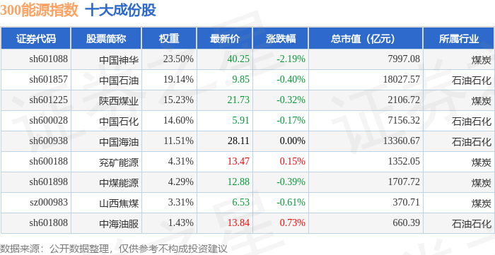300能源(000908)指数十大成份股详情如下: