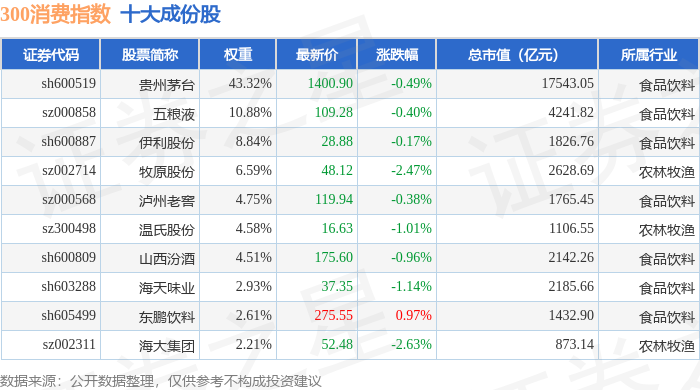 300消费(000912)指数十大成份股详情如下: