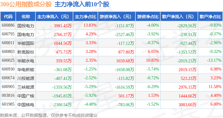 资金流向方面,300公用(000917)指数成份股当日主力资金净流出合计2.42亿元,游资资金净流入合计9352.68万元,散户资金净流入合计1.49亿元。成份股资金流向详情见下表: