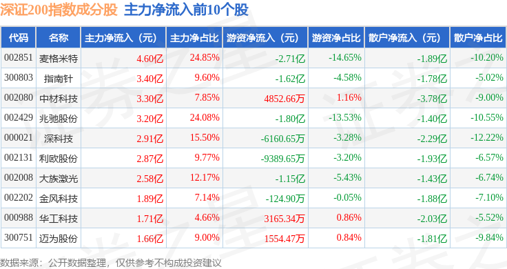 资金流向方面,深证200(399009)指数成份股当日主力资金净流入合计20.96亿元,游资资金净流出合计28.47亿元,散户资金净流入合计7.51亿元。成份股资金流向详情见下表: