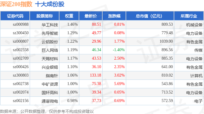 证券之星消息,12月24日,深证200(399009)指数报收于5210.41点,涨1.44%,成交1666.77亿元,换手率1.78%。当日该指数成份股中,上涨的有158家,兆驰股份以10.07%的涨幅领涨,下跌的有39家,中钨高新以5.31%的跌幅领跌。