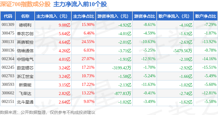 资金流向方面,深证700(399010)指数成份股当日主力资金净流入合计31.15亿元,游资资金净流出合计43.87亿元,散户资金净流入合计12.72亿元。成份股资金流向详情见下表: