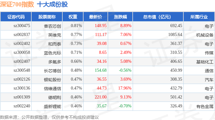 证券之星消息,12月24日,深证700(399010)指数报收于8734.29点,涨1.77%,成交3542.54亿元,换手率2.77%。当日该指数成份股中,上涨的有570家,英唐智控以20.0%的涨幅领涨,下跌的有109家,章源钨业以7.75%的跌幅领跌。