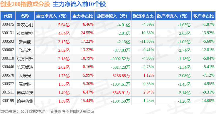 资金流向方面,创业200(399019)指数成份股当日主力资金净流入合计7.6亿元,游资资金净流出合计16.94亿元,散户资金净流入合计9.34亿元。成份股资金流向详情见下表: