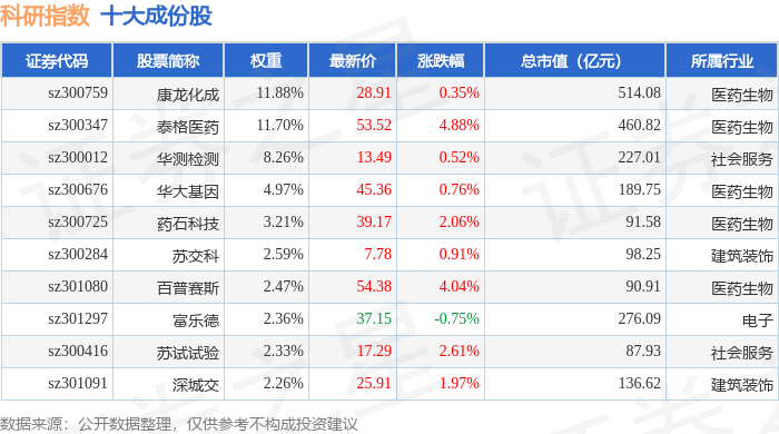 证券之星消息,12月24日,科研指数(399243)报收于1430.78点,涨1.62%,成交88.03亿元,换手率1.83%。当日该指数成份股中,上涨的有57家,谱尼测试以19.95%的涨幅领涨,下跌的有8家,实朴检测以3.49%的跌幅领跌。