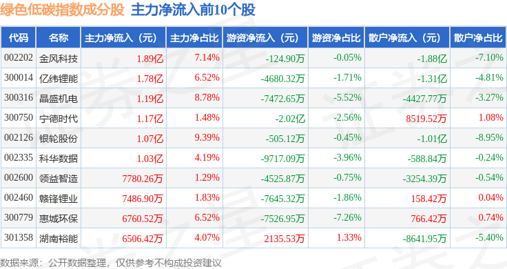 资金流向方面,绿色低碳(399258)指数成份股当日主力资金净流出合计12.53亿元,游资资金净流出合计1461.31万元,散户资金净流入合计12.67亿元。成份股资金流向详情见下表: