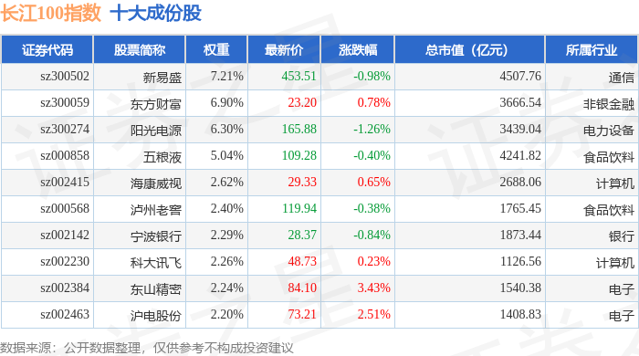 证券之星消息,12月24日,长江100(399278)指数报收于2136.18点,涨0.53%,成交1370.48亿元,换手率1.33%。当日该指数成份股中,上涨的有70家,中伟股份以8.15%的涨幅领涨,下跌的有29家,正邦科技以2.0%的跌幅领跌。