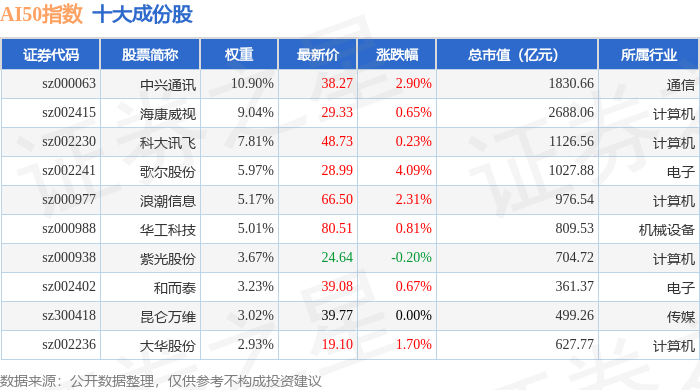 证券之星消息,12月24日,AI50(399284)指数报收于3745.26点,涨1.64%,成交482.25亿元,换手率2.32%。当日该指数成份股中,上涨的有47家,北斗星通以8.42%的涨幅领涨,下跌的有2家,精测电子以0.74%的跌幅领跌。