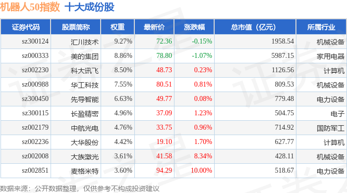 机器人50(399283)指数十大成份股详情如下: