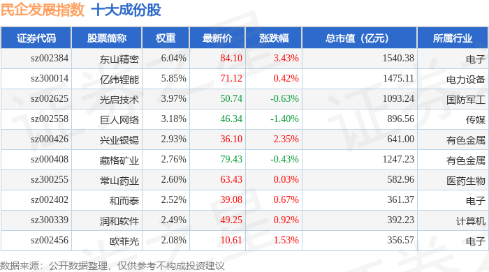 证券之星消息,12月24日,民企发展(399292)指数报收于1482.13点,涨1.19%,成交972.68亿元,换手率3.35%。当日该指数成份股中,上涨的有195家,英唐智控以20.0%的涨幅领涨,下跌的有43家,宁波东力以10.01%的跌幅领跌。