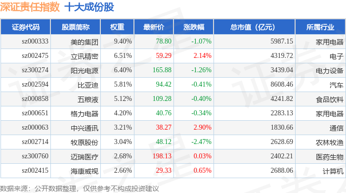 深证责任(399341)指数十大成份股详情如下: