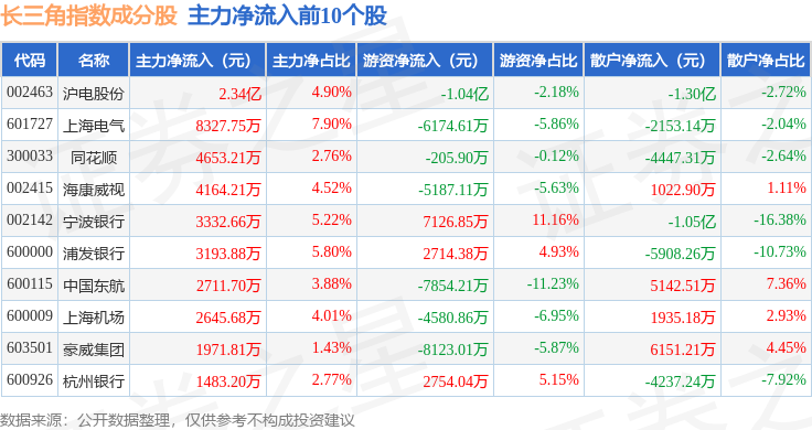 资金流向方面,长三角(399355)指数成份股当日主力资金净流出合计8.4亿元,游资资金净流入合计1.69亿元,散户资金净流入合计6.71亿元。成份股资金流向详情见下表: