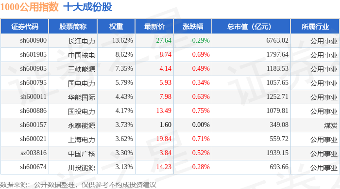 证券之星消息,12月24日,1000公用(399390)指数报收于2671.32点,涨0.48%,成交125.46亿元,换手率0.53%。当日该指数成份股中,上涨的有31家,九丰能源以10.0%的涨幅领涨,下跌的有8家,华电国际以0.57%的跌幅领跌。