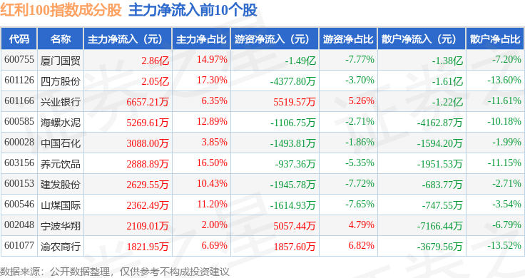 资金流向方面,红利100(399411)指数成份股当日主力资金净流出合计6.83亿元,游资资金净流入合计6.58亿元,散户资金净流入合计2576.44万元。成份股资金流向详情见下表: