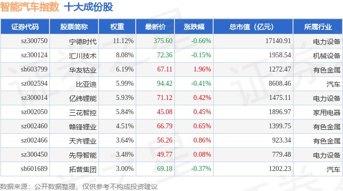 智能汽车(399432)指数十大成份股详情如下: