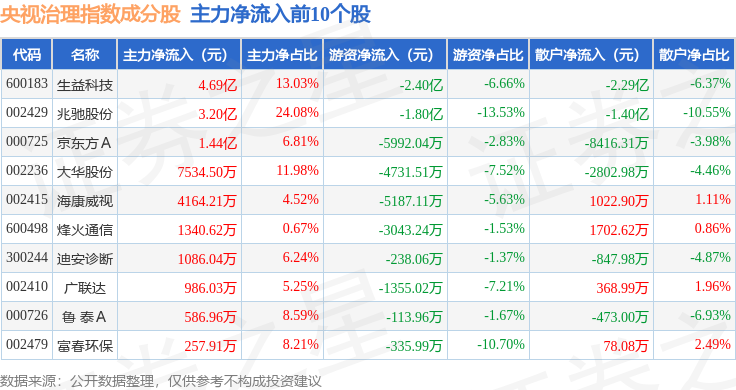 资金流向方面,央视治理(399554)指数成份股当日主力资金净流出合计3.41亿元,游资资金净流出合计1.08亿元,散户资金净流入合计4.49亿元。成份股资金流向详情见下表: