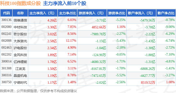资金流向方面,科技100(399608)指数成份股当日主力资金净流出合计2.0亿元,游资资金净流出合计3.92亿元,散户资金净流入合计5.92亿元。成份股资金流向详情见下表: