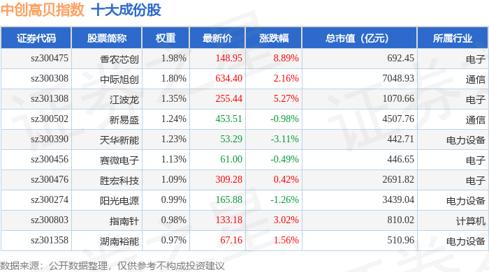证券之星消息,12月24日,中创高贝(399666)指数报收于2049.1点,涨1.87%,成交3134.91亿元,换手率3.61%。当日该指数成份股中,上涨的有172家,信维通信以17.96%的涨幅领涨,下跌的有23家,联特科技以3.27%的跌幅领跌。