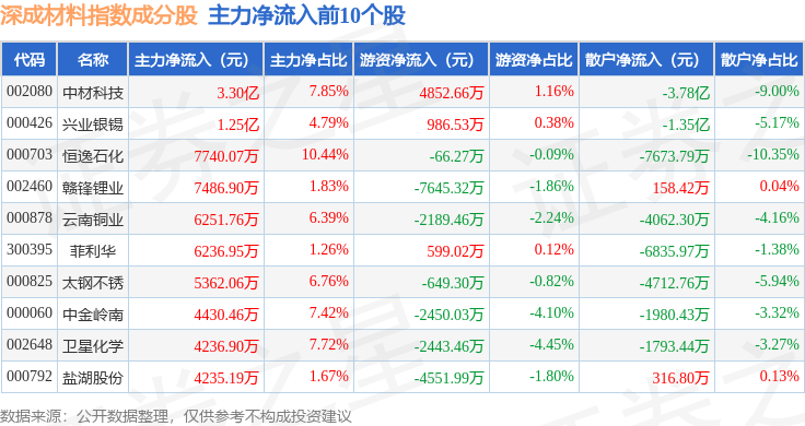 资金流向方面,深成材料(399681)指数成份股当日主力资金净流入合计1.14亿元,游资资金净流出合计2.09亿元,散户资金净流入合计9526.44万元。成份股资金流向详情见下表: