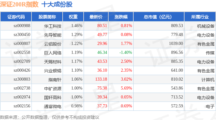证券之星消息,12月24日,深证200R(399679)指数报收于6304.15点,涨1.44%,成交1666.77亿元,换手率1.78%。当日该指数成份股中,上涨的有158家,兆驰股份以10.07%的涨幅领涨,下跌的有39家,中钨高新以5.31%的跌幅领跌。