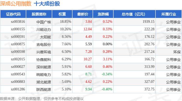 证券之星消息,12月24日,深成公用(399689)指数报收于854.61点,涨0.36%,成交25.8亿元,换手率0.43%。当日该指数成份股中,上涨的有9家,协鑫能科以3.11%的涨幅领涨,下跌的有4家,陕西能源以0.4%的跌幅领跌。