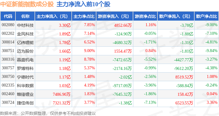 资金流向方面,中证新能(399808)指数成份股当日主力资金净流出合计3.82亿元,游资资金净流出合计10.78亿元,散户资金净流入合计14.2亿元。成份股资金流向详情见下表: