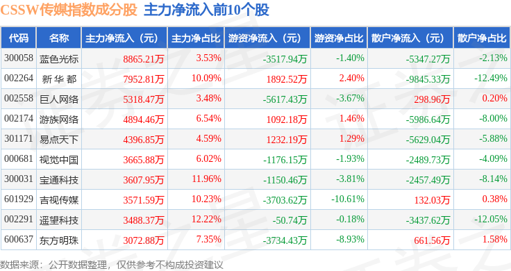 资金流向方面,CSSW传媒(399810)指数成份股当日主力资金净流出合计4.3亿元,游资资金净流出合计5118.53万元,散户资金净流入合计4.81亿元。成份股资金流向详情见下表: